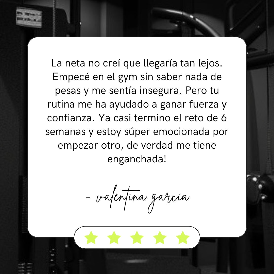 ¡Solo motivación! Este reto está creado para entrenar con mancuernas, pero también puedes usar botellas de agua o tu propio peso corporal. No hay excusas. Lo único que necesitas son las ganas de transformar tu cuerpo.