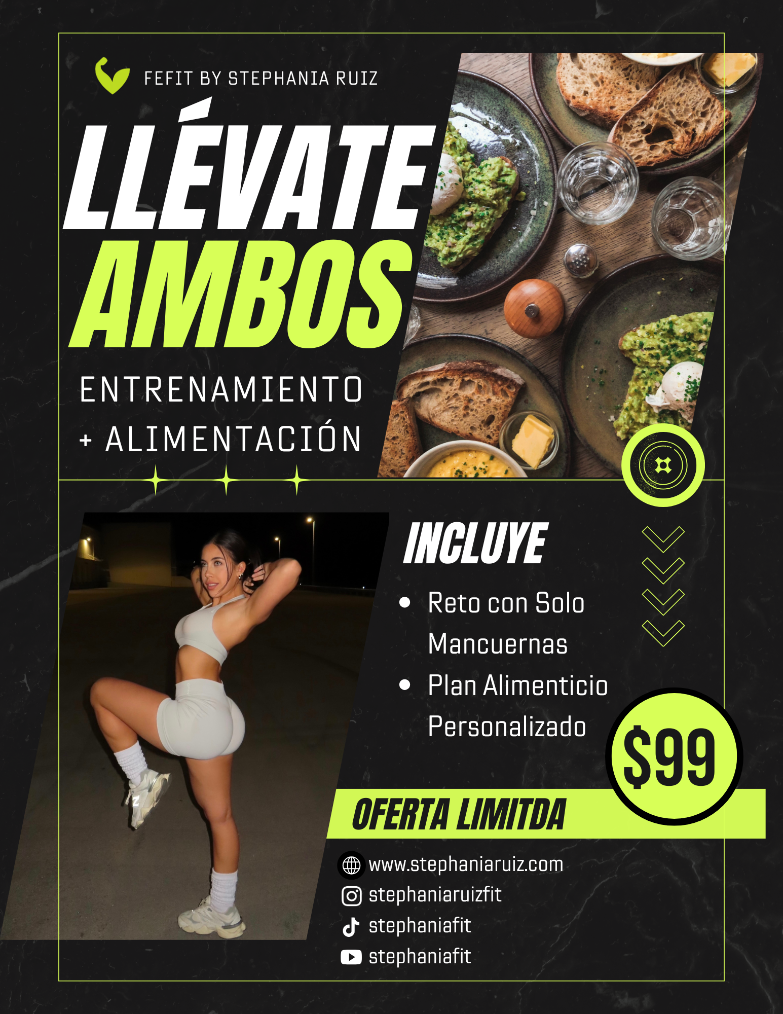 ¡Es tu momento de brillar y transformar tu cuerpo! Llévate el combo perfecto: un plan alimenticio 100% personalizado y un reto de entrenamiento con mancuernas, ¡todo con un 10% de descuento adicional!